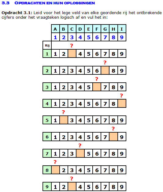 In 28 lessen gaat u met deze geringe voorkennis leren om hoe u stap-voor-stap een Sudoku moet oplossen. We beginnen heel eenvoudig door het nog enige ontbrekende cijfer in een rij met geordende cijfers logisch af te leiden, en bouwen dit langzaam op tot het logisch afleiden van de nog ontbrekende cijfers in uw eerste op te lossen Sudoku. De uitwerking van elk stap van een les, met de oplossing hiervan, wordt gegeven na deze les.