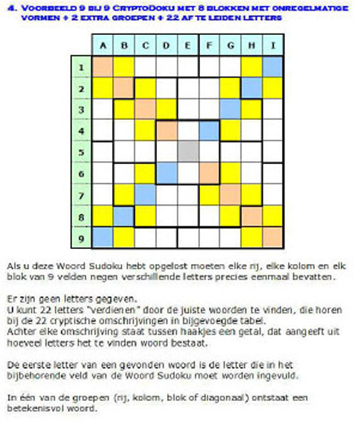In deze CryptoDoku moet u 20 letters afleiden uit hun cryptische omschrijving om deze vorm van een Woord Sudoku, met 4 extra toegevoegde groepen, uniek te kunnen oplossen.