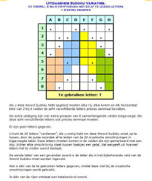 | 01 CrDNL | 8 bij 8 CryptoDoku met 20 af te leiden letters + 4 extra groepen | € 1,00 |