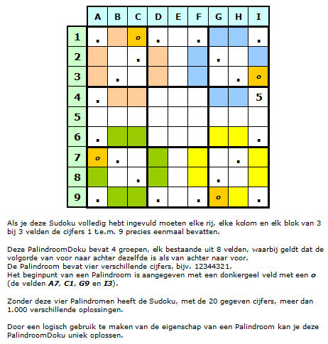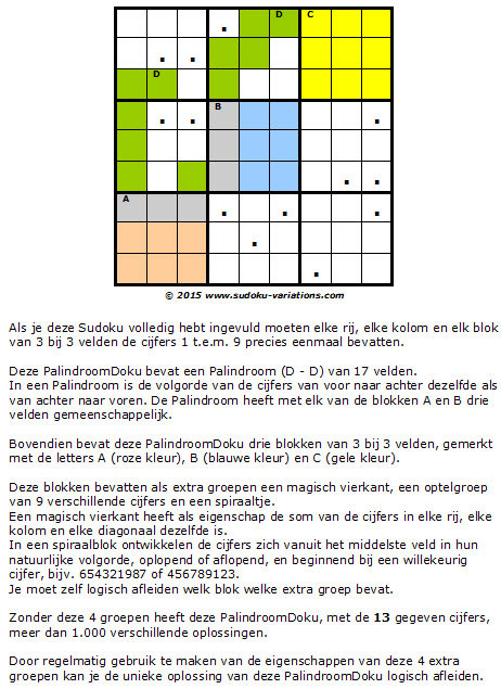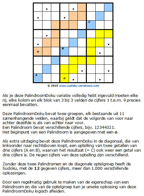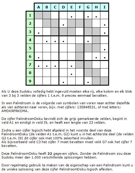 De PalindroomDoku is een uitdagende Sudoku variant waaraan één of meer groepen van samenhangende velden zijn toegevoegd, waarin de volgorde van de cijfers van voor naar achter dezelfde is als van achter naar voor.