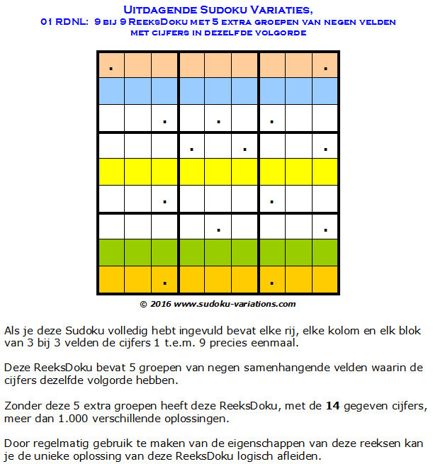 Deze 9 bij 9 ReeksDoku bevat als extra uitdaging 5 extra groepen van 9 samenhangende velden met de cijfers in dezelfde willekeurige volgorde.