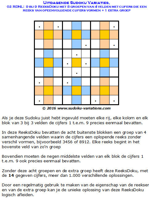 Deze 9 bij 9 ReeksDoku bevat als extra uitdaging 8 extra groepen van 4 samenhangende velden met de cijfers een oplopende volgorde.