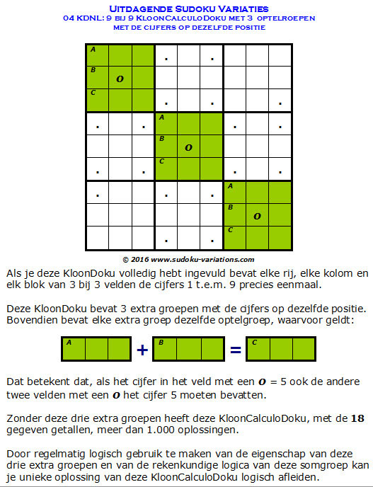 Deze KloonDoku bevat als extra uitdaging 10 maal 2 extra groepen van twee samenhangende velden, waarvan de som van de cijfers = 18.