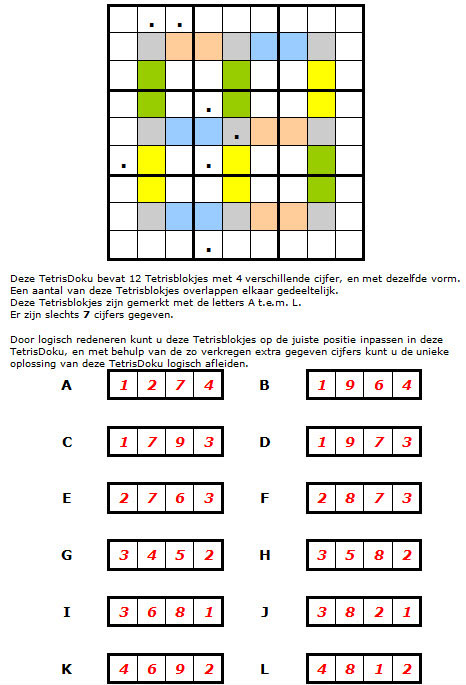 Deze 9 bij 9 TetrisDoku bevat 12 Tetrisblokjes van dezelfde vorm met 4 verschillende cijfers. Deze blokjes overlappen elkaar deels (grijze velden).
