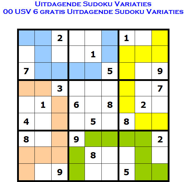 Deze 9 bij 9 Uitdagende Sudoku Variatie bevat als extra uitdaging 7 extra groepen van negen samenhangende velden, die de cijfers 1 t.e.m. 9 ook precies eenmaal moeten bevatten.