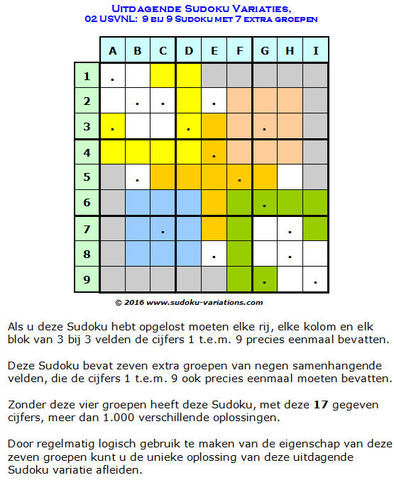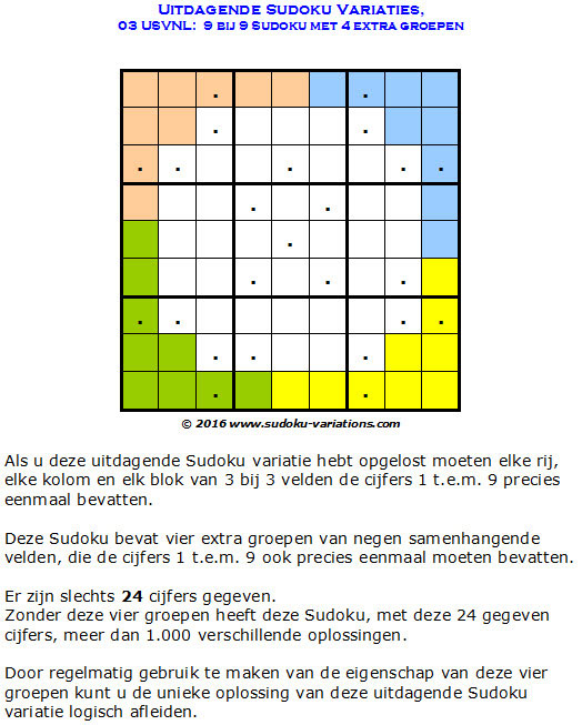 Deze 9 bij 9 Uitdagende Sudoku Variatie bevat als extra uitdaging 4 extra groepen.