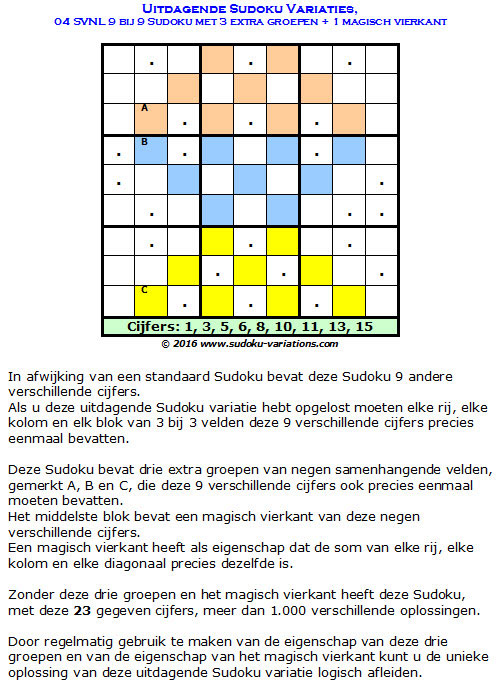 Als extra uitdaging bevat deze puzzel bovendien in het middelste blok een magisch vierkant van deze andere cijfers 1, 3, 5, 6, 8, 10, 11, 13 en 15.