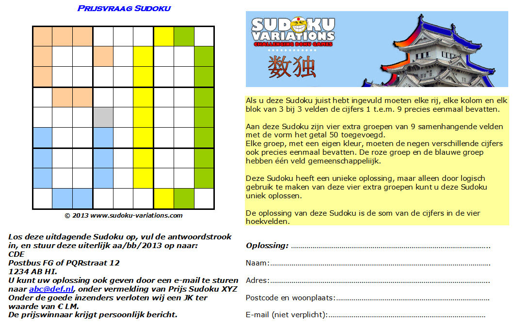 Een kwalitatief hoogwaardige Sudoku variatie is bij uitstek de gelegenheid om product en/of dienst of uw speciale acties op een opvallende manier te promoten.