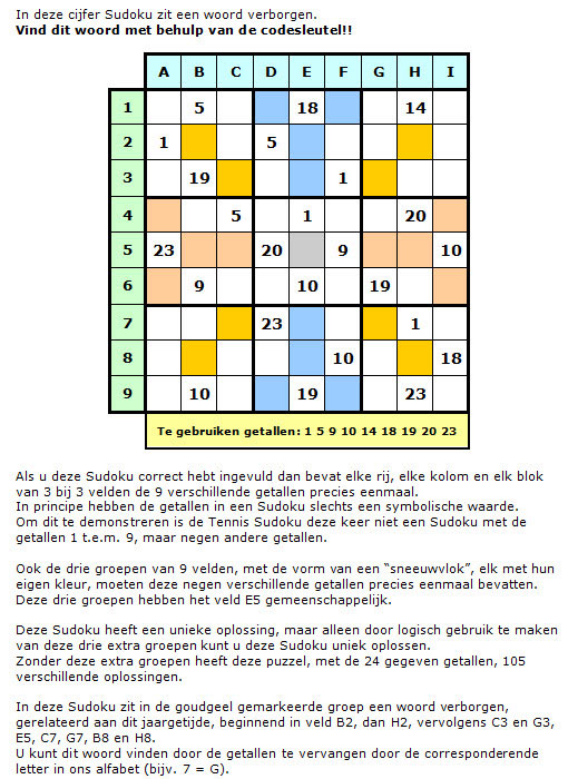 Deze Prijspuzzel Sudoku’s ontwerp ik zodanig o.a. voor thematische magazines en dagbladen zowel met cijfers als met letters dat ze een unieke oplossing hebben, maar dan met één of meer samenhangende velden, die deze verschillende symbolen ook precies eenmaal moeten bevatten.