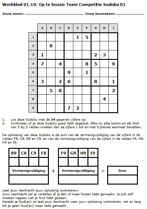 Elke leerling lost eerst zelf in zijn eigen tempo, maar wel tegelijkertijd met de overige leden van diens team, twee standaard 9 bij 9 Sudoku’s op: een relatief eenvoudige en een pittiger. Deze Sudoku’s zijn genummerd 1 t.e.m. 8.