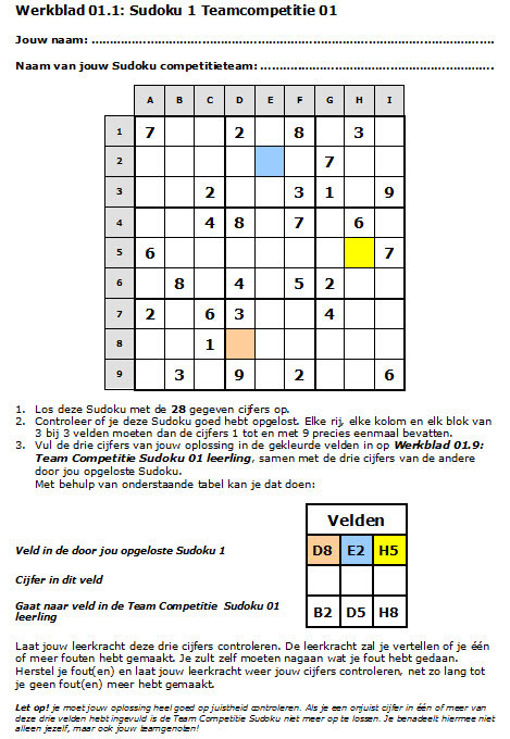 De oneven genummerde Sudoku’s zijn de relatief eenvoudige en hebben 28 gegeven cijfers. De even genummerde Sudoku’s zijn pittiger en hebben 24 gegeven cijfers. Per team ontstaan dan in totaal acht opgeloste Sudoku’s. Als een leerling de twee Sudoku’s goed heeft opgelost moeten dus de cijfers in de drie gemerkte velden worden overgebracht naar aan deze gekoppelde velden van de zogeheten Team Competitie Sudoku.